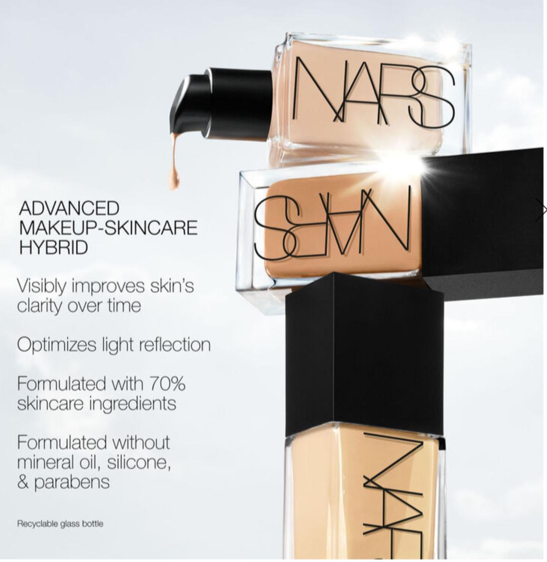 完美底妆始于最美的光线。 NARS全新Light Reflecting原生光亮肌粉底液带来崭新配方,首支护肤结合化妆的双效粉底,能即时平滑肌肤、达至柔焦美肌效果,脸上的痘印、红印及肤色不均的问题亦能轻易遮盖。独家「光遮瑕」技术,提升肌肤捕捉和折射光线的能力,犹如一面独特的棱镜,映射出润泽亮肌,并且有助防御外界污染。当中的护肤成分能让肌肤于6周后更明亮,即使在卸妆后亦能持续改善肌肤透亮度*。配方蕴含抗污染成分,能抵御因环境压力而带来的肌肤问题及抗蓝光效果,建立肌肤防御屏障,肌肤持续健康补水。适合任何肌肤,特别是敏感肤质。具中度遮瑕,可叠涂使用提升遮瑕度,展现自然妆容。底妆透薄长效,共有19款色调。化妆同时养肤,轻透质感绽放原生光采。
