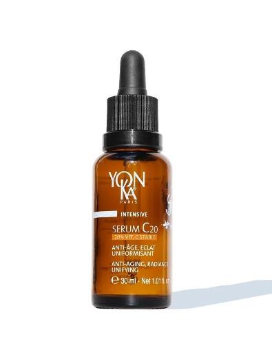早上或晚上,潔膚及噴灑Yon-Ka保濕植物爽膚水後,以6-8滴C20亮白精華滴入手心,