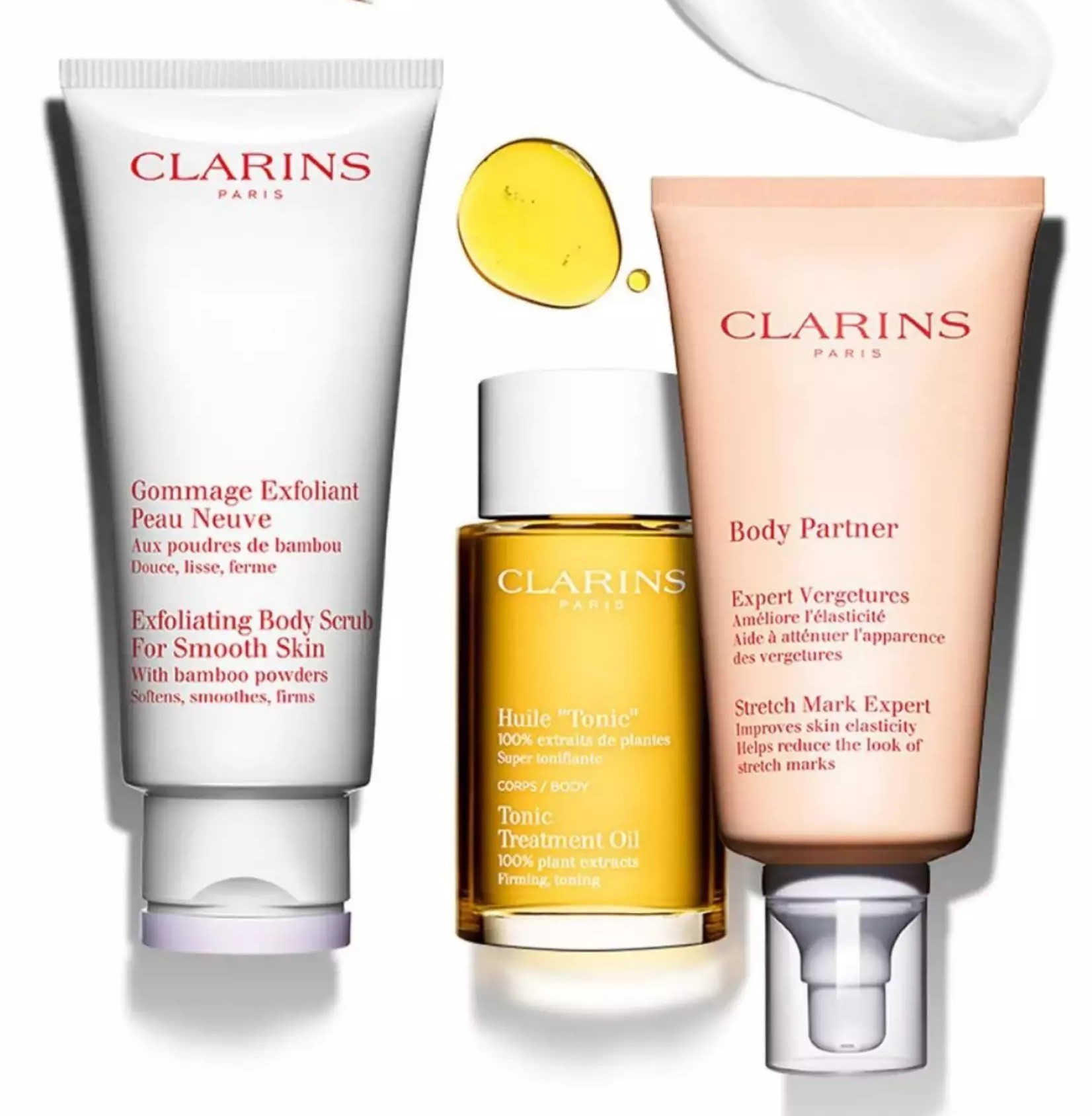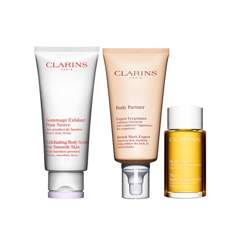 Your beauty essentials to target the look of stretch marks and preserve firm skin, as the months go by. Exfoliating Body Scrub 200ml The first, essential body beauty step for smooth, soft, firm skin. Includes: Tonic Body Oil 100ml Stretch Mark Control 200ml Exfoliating Body Scrub 200ml Tonic Body Treatment Oil 100ml The most effective body oil to tone and improve skin elasticity and firmness. Stretch Mark Minimizer 200ml A cream with extensive actions to diminish the look of stretch marks. Clarins beauty brochure 'Pregnancy, the most beautiful days of your life' Beauty advice for the face and body, before and after pregnancy.