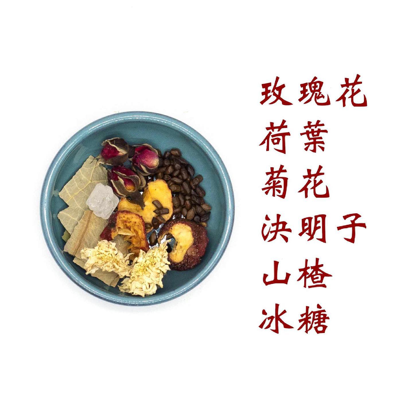 成份: 玫瑰花, 荷葉, 菊花, 決明子, 山楂, 冰糖